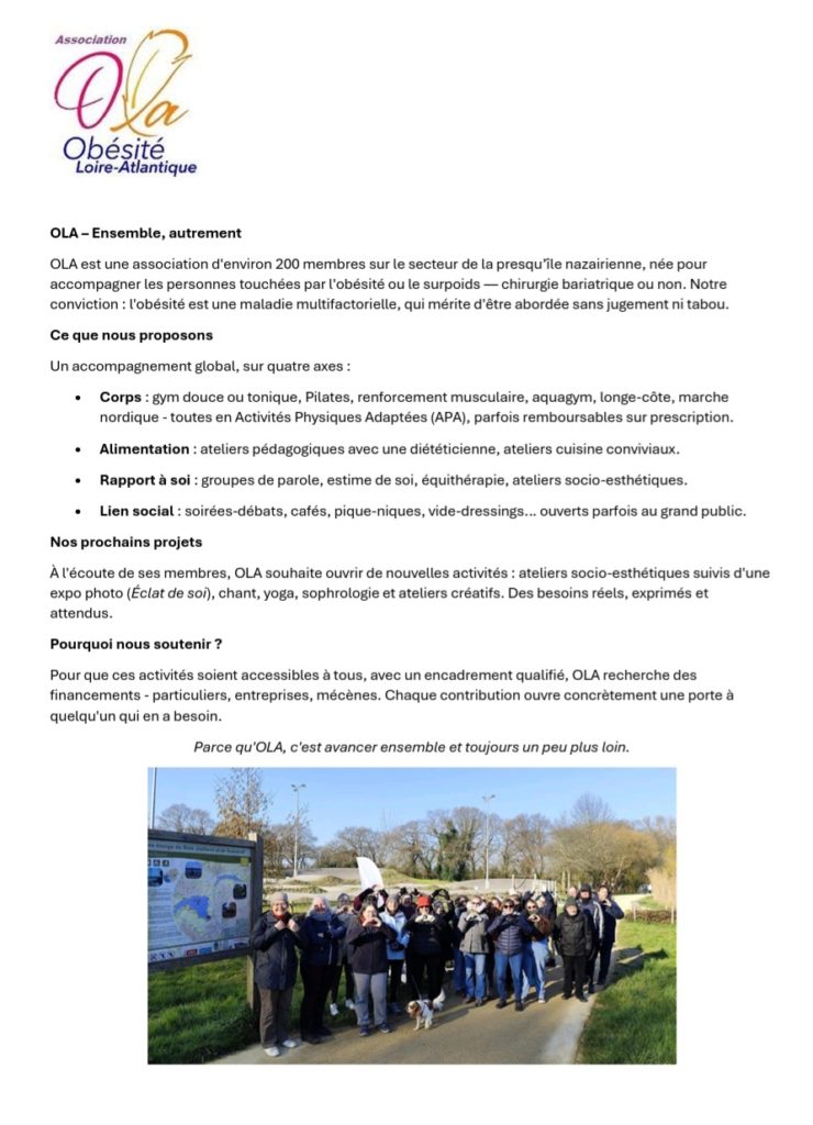 Parce que l’obésité n’est plus un tabou, la mission de l’association Ola (Obésité Loire Atlantique) est d'aider et d'accompagner les personnes souffrant de surpoids en leur proposant des activités adaptées et variées toutes encadrées par des professionnels diplômés.